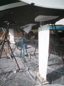 I’m happy to say that yesterday we finished up the sanding and grinding.  It was painful labor but the mp3 player helped immensely. Today it’s raining, so tomorrow I’ll start the tedious process of filling the blisters, applying 5 coats of barrier coat and 2 coats of bottom paint.