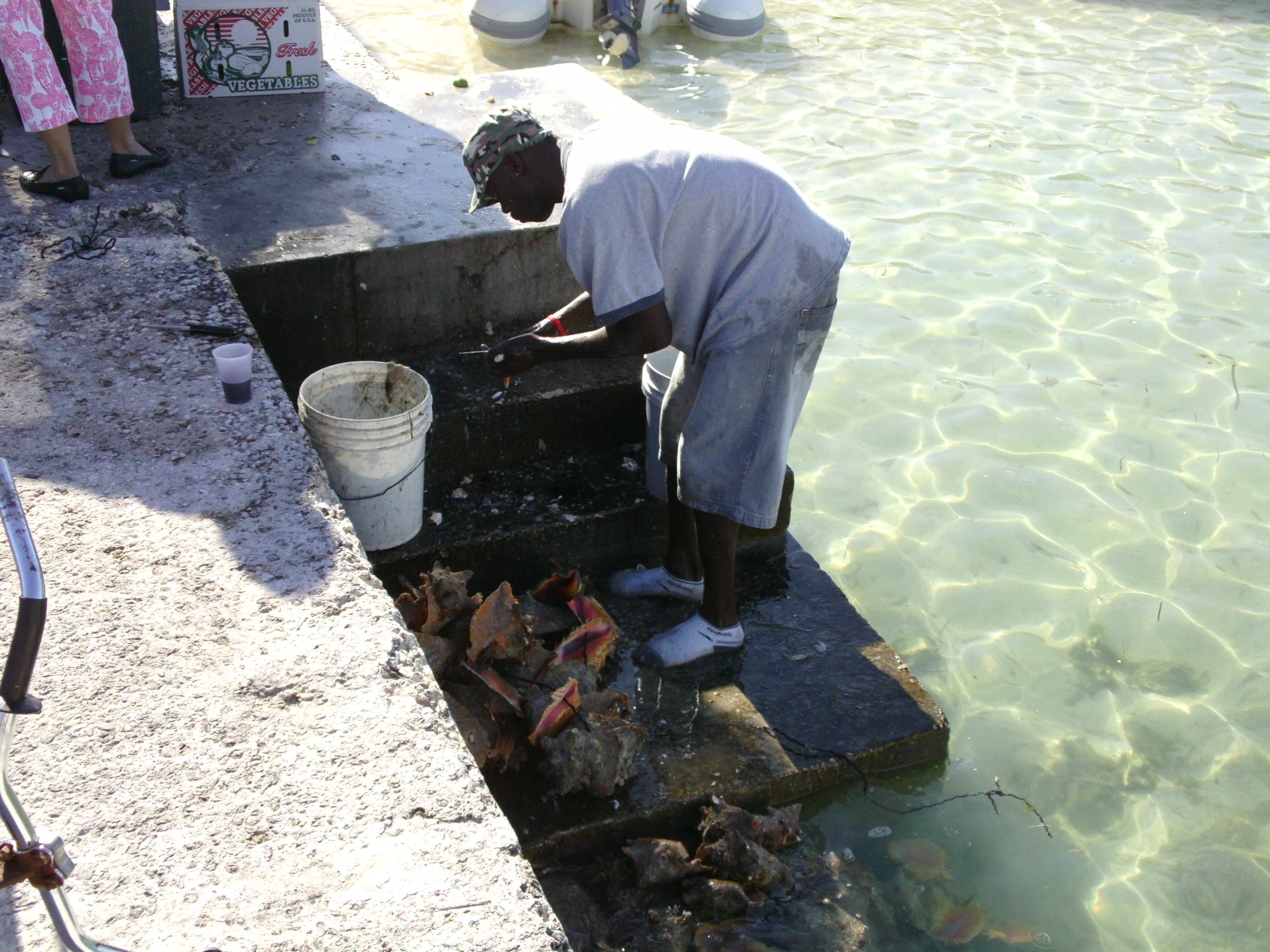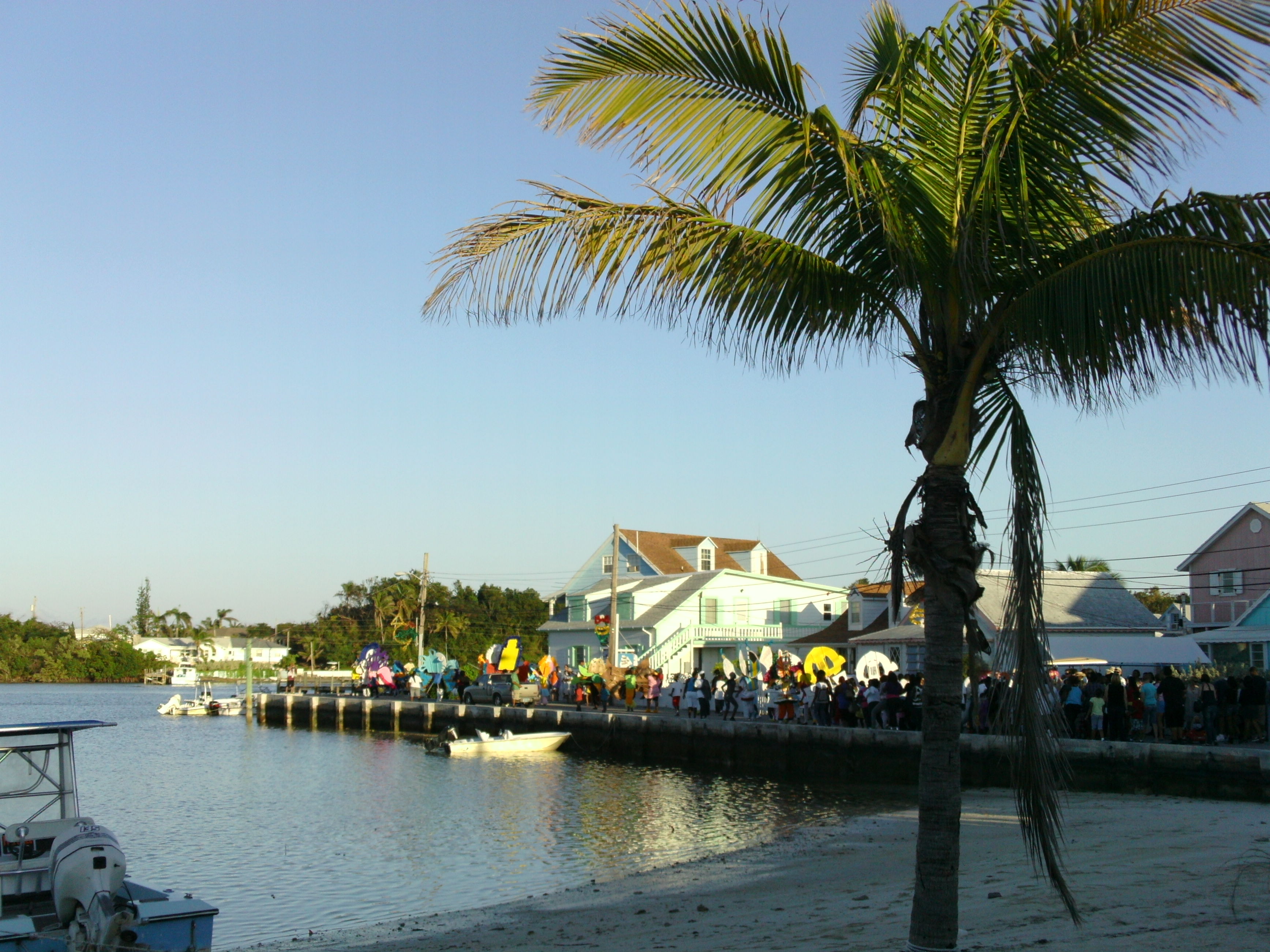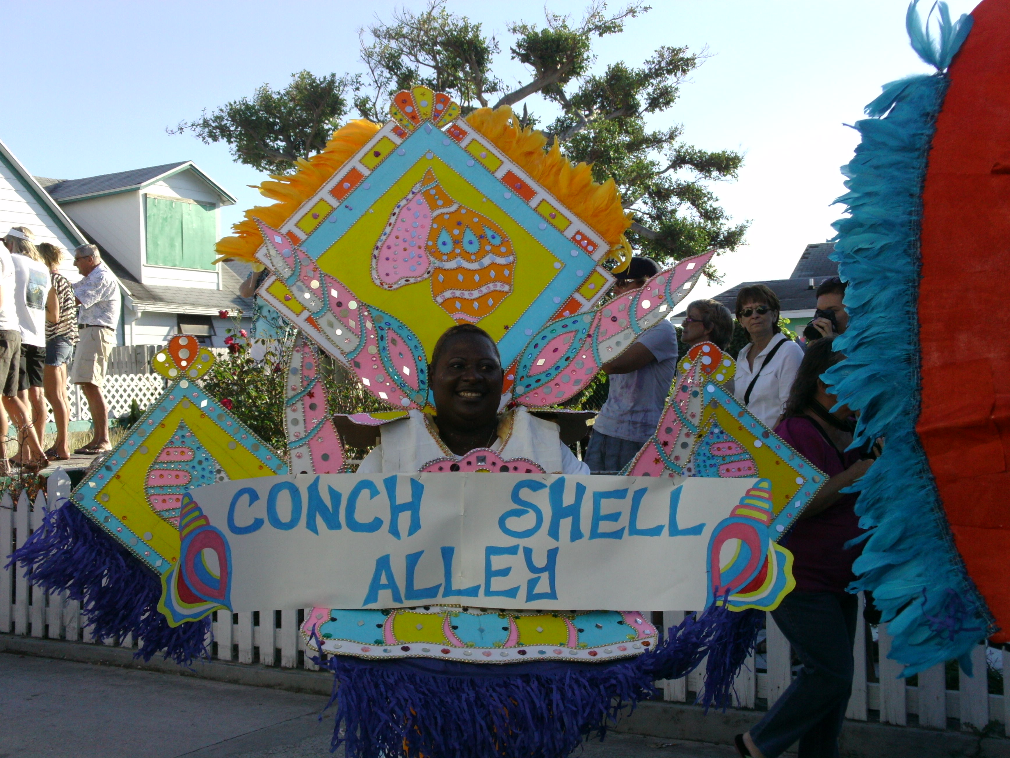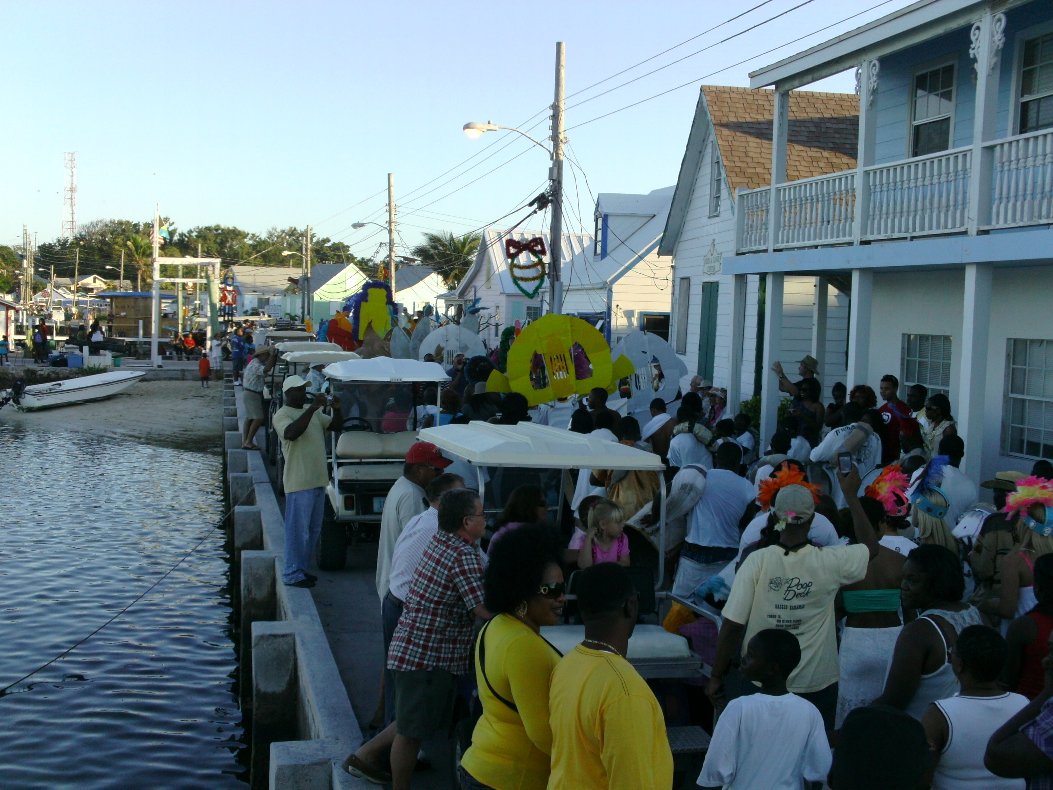We were able to raft off the dinghy at the public dock and head ashore. The parade was definitely running on “Island Time,” it was advertised to start at 2:00 and finally kicked off a little before 4:00. My theory was that this kept all the visitors milling about town and going to the numerous conch stands and bars. There was a stand on the public dock operated by a man and a woman with another guy cleaning fresh conch in the water nearby. The gentleman at the stand painstakingly made conch salad fresh about 10 servings at a time. You had to get a ticket and wait in line for over an hour to get one of the salads, but everyone said it was worth it. I didn’t have the will to wait so I purchased the conch fritters which were delicious.