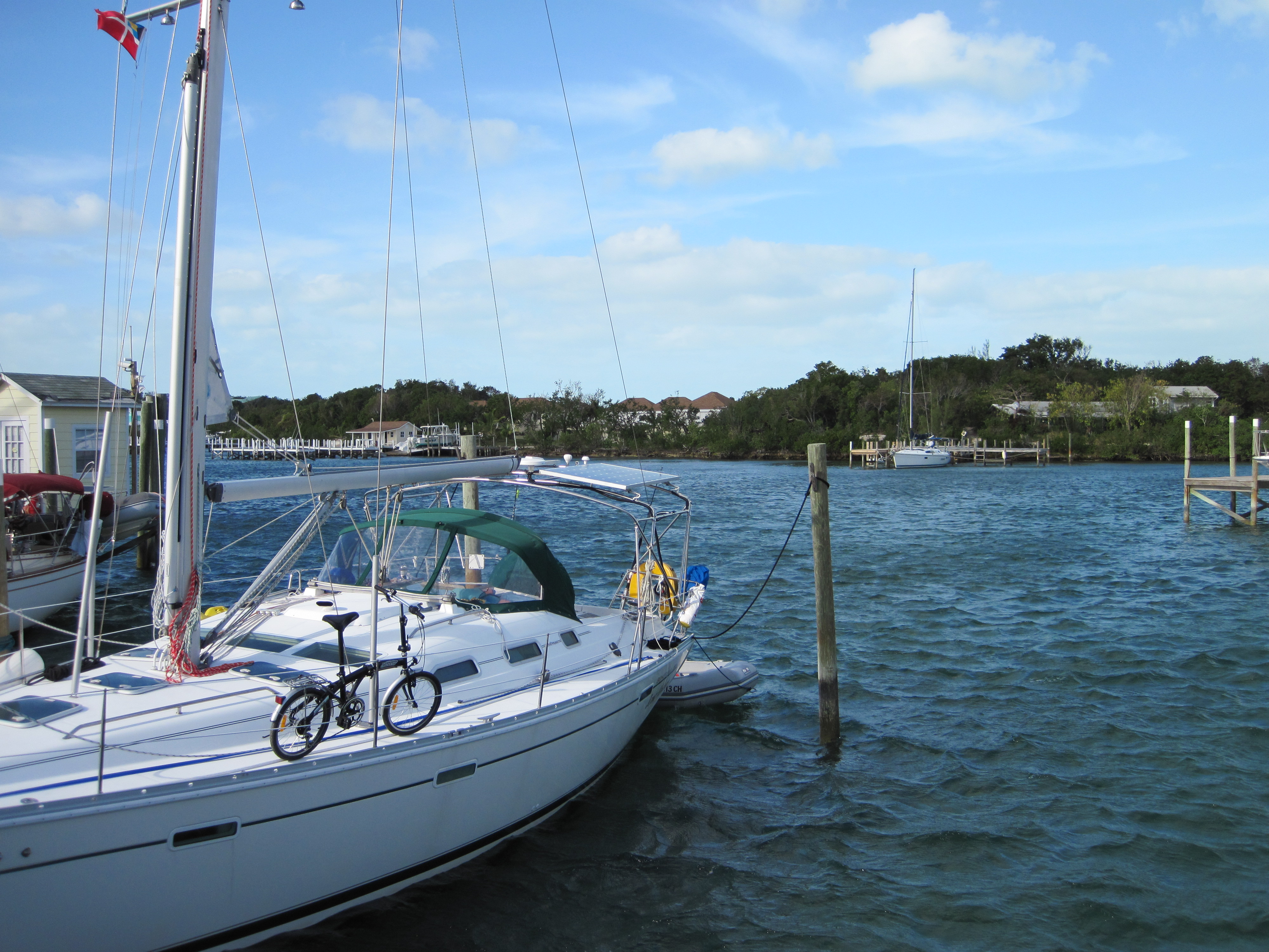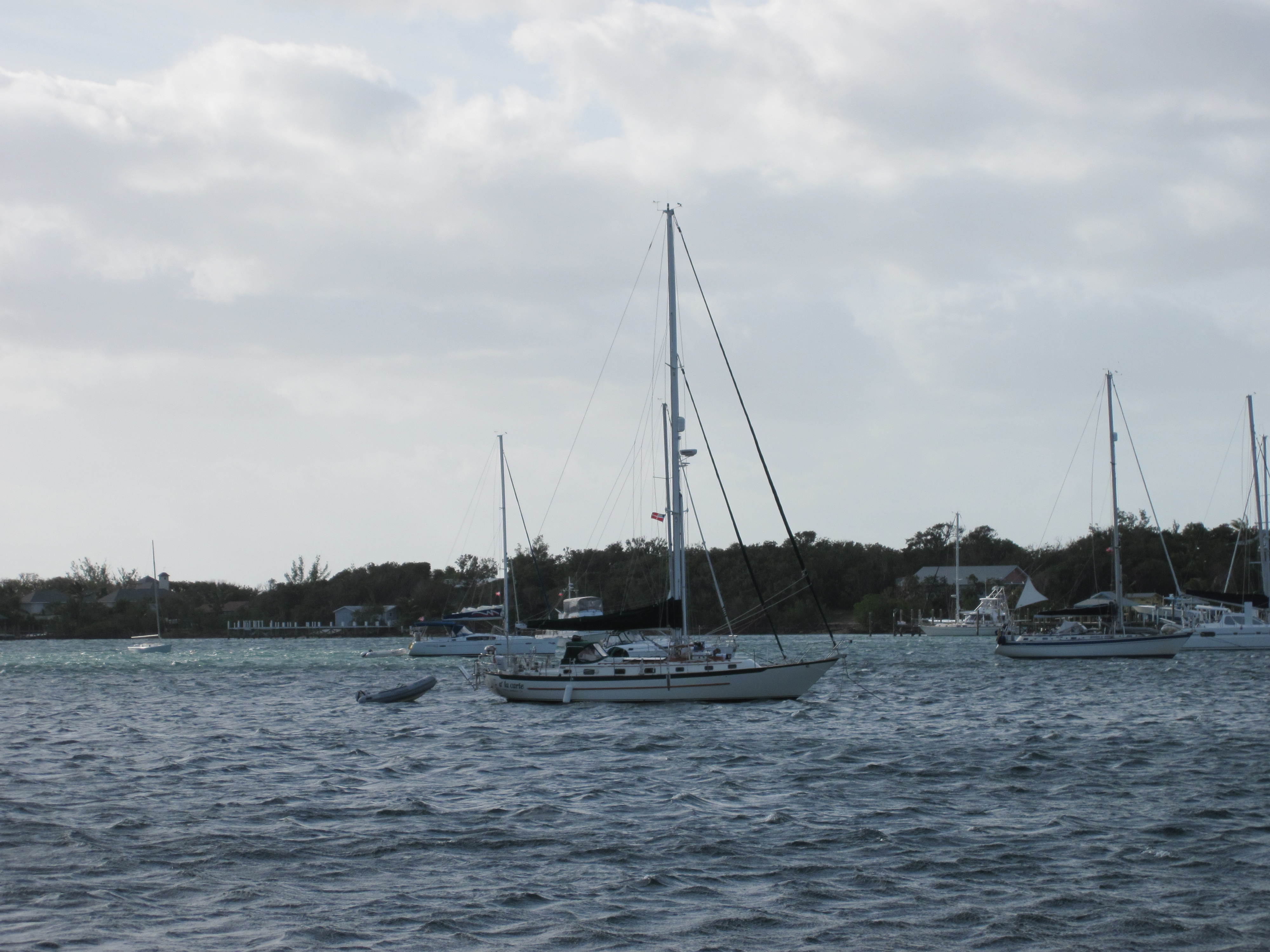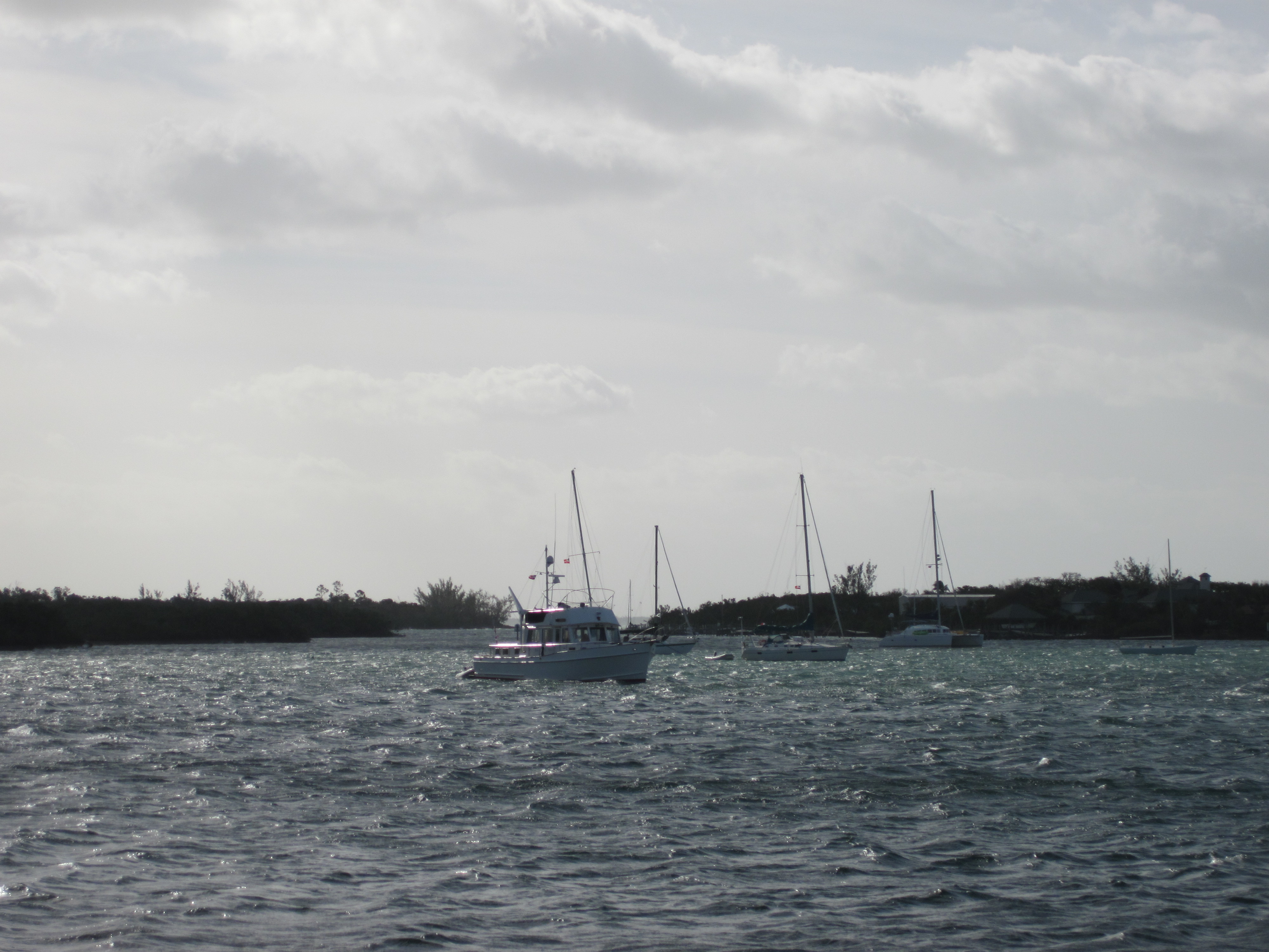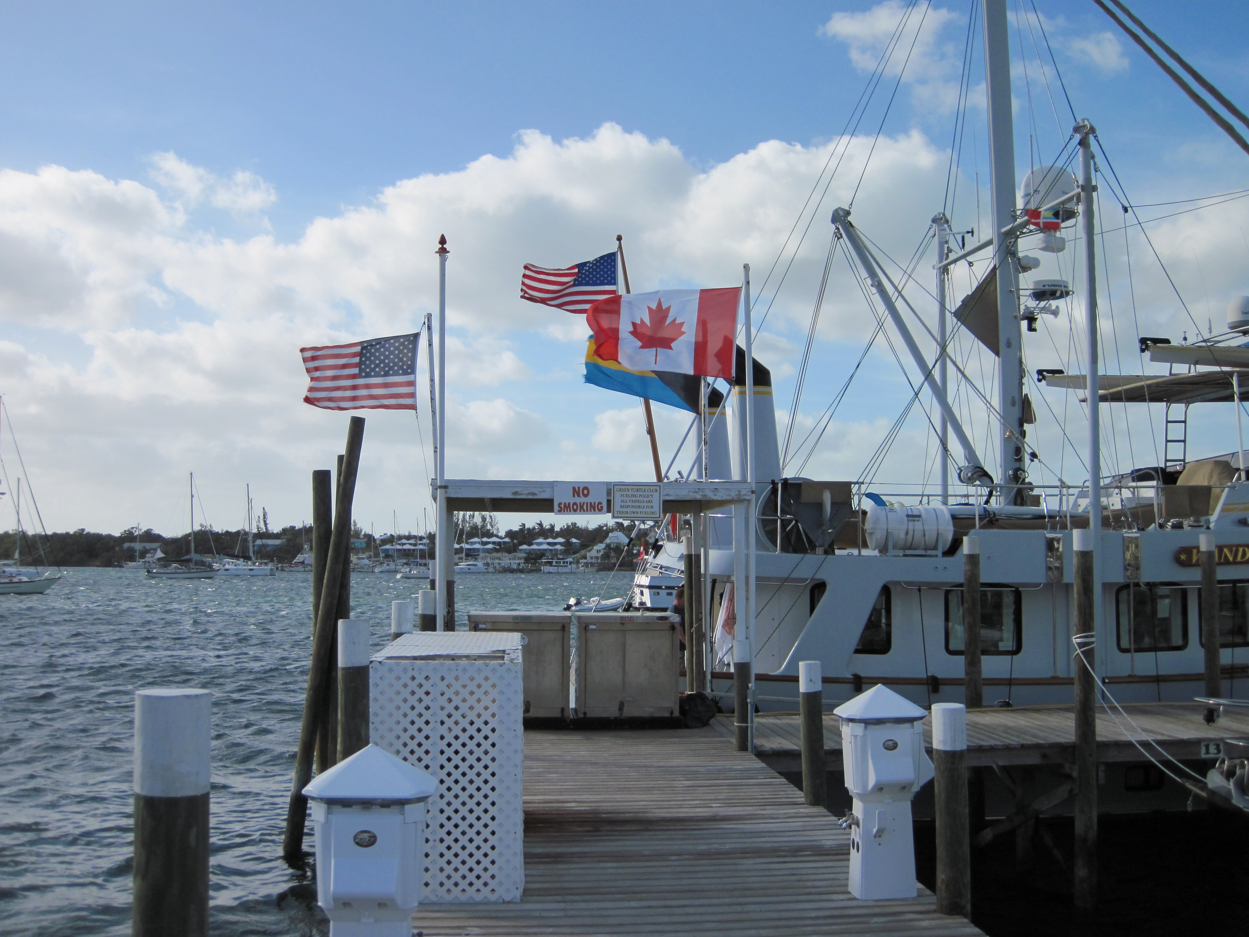 Barometer Bob was predicting a gale for today, 20-25 knots from the WNW with higher gusts! A report came over the VHF from a guy on the other side of the island this morning that said he saw a 54 knot gust (that sounded a little high, I would put them at 35, he was French, maybe it was in kilometers/hr?) and the VHF keeps chirping with boats calling each other saying “You’re dragging down on me!” Needless to say we’re still hanging out here at the Green Turtle Club Marina. I would say we’re “safely” in a slip, but there’s not too much safe about it. We have two slender pilings holding us stern-to the wind and I’m hoping they’re solid. The finger pier doesn’t even extend to midship, so I got creative with the spring lines to ease the pressure on these pilings. White Sound here on GTC seems like a great place to ride out the wind, but even here there are white caps in the anchorage, I can’t imagine what the Sea of Abaco is like.