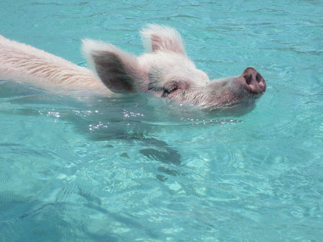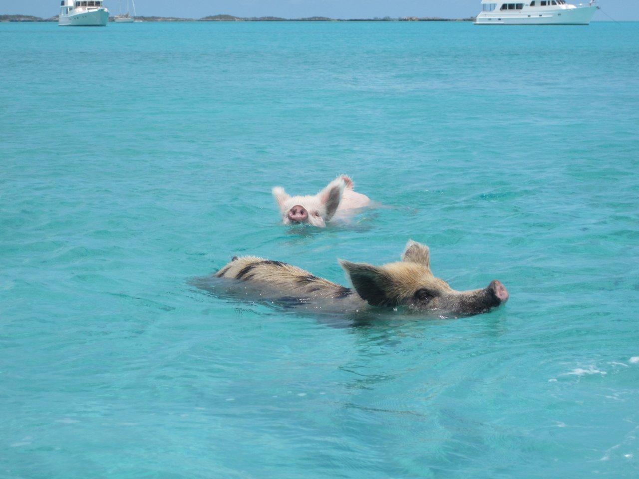 Big Majors Spot is notorious for the friendly pigs on the beach. They come out for scraps brought in by the boaters. We didn’t have too many scraps, so Sabrina and I waited until some other boats were headed in and then went in to check out the scene. It’s strange to watch these pigs swimming in crystal clear water. They keep their snouts above water and I wonder how long they can comfortably swim, they obviously seem very buoyant. Our friends on Kianda saw piglets on the beach, but unfortunately we only saw four large pigs. Maybe the piglets hold out for the really good scraps? (The downside to all the scraps is there are a bunch of noisy seagulls in the anchorage competing for the same food. Nermal keeps staring them down, and I think he thinks he can catch one.)