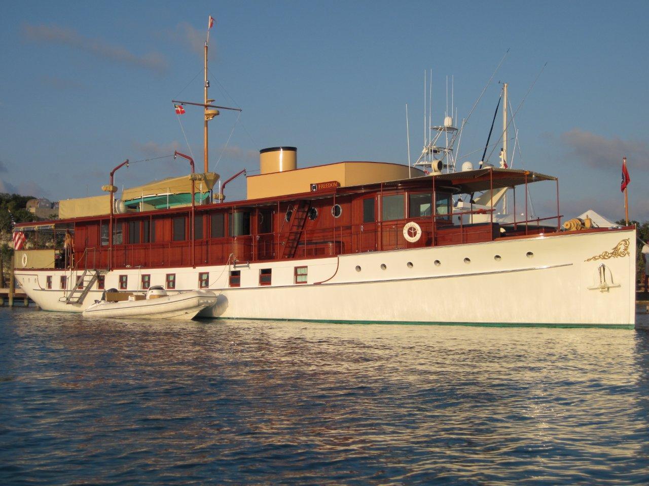 While on our way to the SCYC we ran into Lisa from our snorkeling “rescue.” She thanked us again and introduced us to her husband Mike. They were guests on M/V Freedom but asked if we’d like a tour. We didn’t want to impose, but they assured us it was no imposition and we were very curious. The boat is immaculate both inside and out and very tastefully done. The captain explained that they tried to keep to the original design wherever possible, but the engines and all the systems were modern. The boat was bought in dilapidated condition for $100 in Florida and the restoration took 7 years and was completed 3 years ago. (I didn’t feel right taking photos inside, but you can see the one we snapped of Freedom laying at the dock below.)