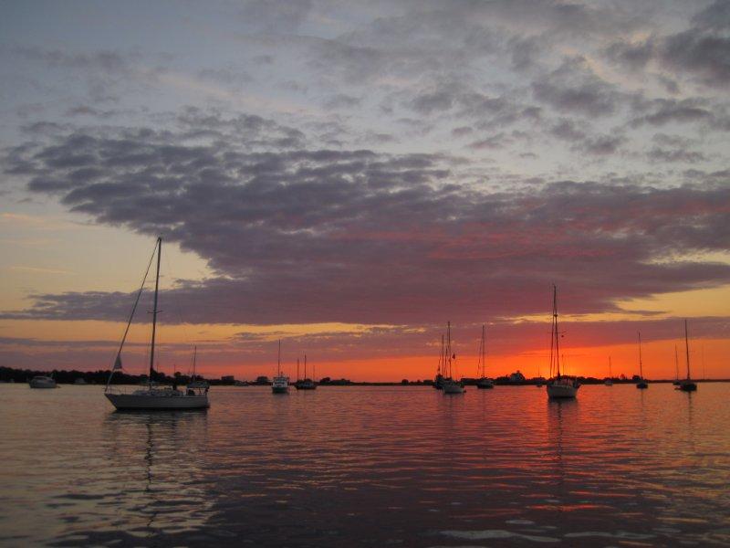 We ate a hot lunch of chicken gumbo (gumbo in August? Yeah it’s colder here,) then we took naps before our friends Jay and Tanya arrived on S/V Minx. Minx anchored next to us and we had dinner aboard JV while we were treated to a beautiful sunset as the rain cleared out. Sunday morning while aboard Minx eating blueberry pancakes, we heard a small boat running around the harbor shouting/singing “An-di-a-mo! Andiamo!” The boat is run by Aldo’s bakery and has been delivering fresh baked goods to the boaters for 43 years. His selection of danishes, Portuguese sweet bread, hot sandwiches, coffee, and assorted pastries were mouthwatering. Tanya selected a few items and we watched afterwards as he pulled up to almost every other boat in our area.