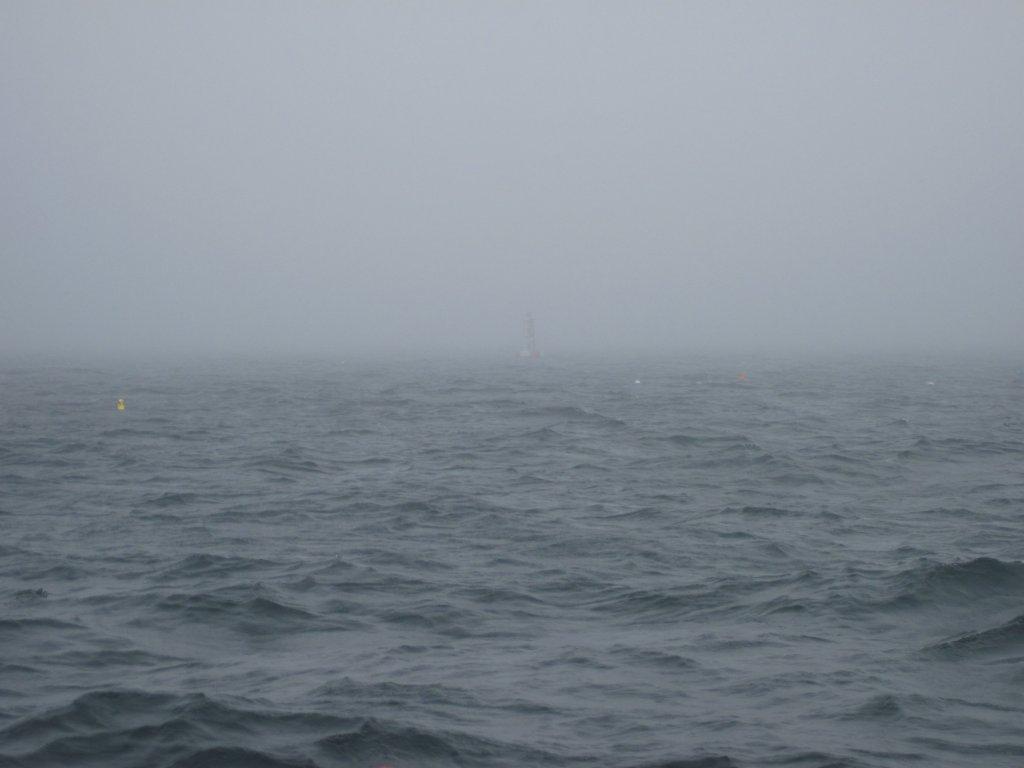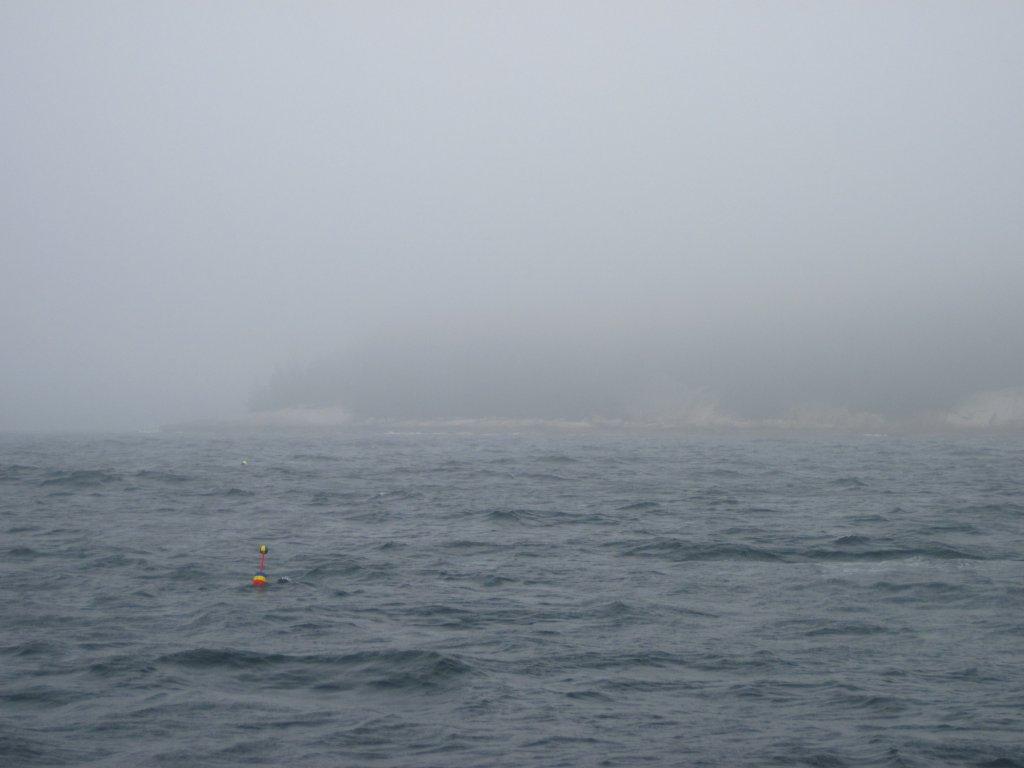 We left our dead calm anchorage under cloudy skies, planning to sail through the Deer Isle Thoroughfare. 10 minutes later we had made a 180 degree turn, buffeted by 25 knot winds on the nose that were screaming through the tight passage of the Thoroughfare. We decided to head east across Jericho Bay, now fully understanding why there was a “Small Craft Advisory.” If we thought that dodging lobster buoys in calm weather was fun, we had a blast dodging them in 2-4 foot waves! And it was right about that time that the fog descended….