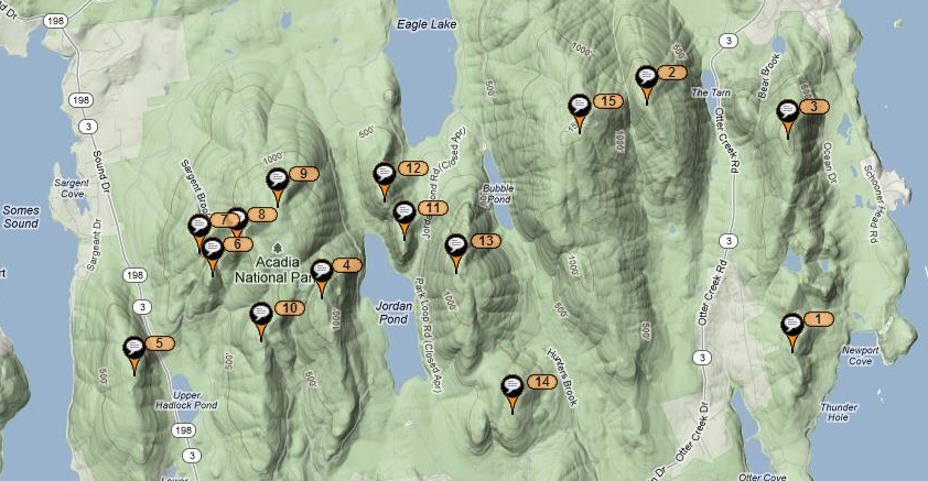 We carried the Spot and you can see the geographical location of 15 of the summits recorded below. Unfortunately we didn’t have the Spot with us when we climbed the Beehive, we didn’t find the trail to Huguenot Head, and for some reason the Day Mountain mark didn’t go through. Overall we covered over 30 miles (including 10 yesterday) and if you add our 18 summits it equals 17,108 feet! While we enjoyed the climbs, to put that in perspective that total is only good for the 4th highest mountain in the USA, between Mt. Foraker and Mt. Bona (had to google that one….)